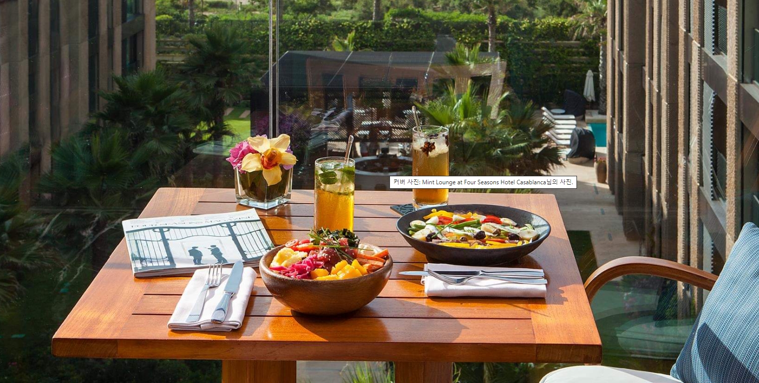 포시즌스 호텔 카사블랑카는 5성급의 럭셔리 호텔로서 최고의 호스피탈러티를 카사블랑카에서 경험하고 싶다면 들러 보길 바란다. 물론 다이닝 레스토랑 앤 바도 최고의 수준이다. 레스토랑 ‘블루(Bleu)’에서는 대서양 연안에서 매일매일 잡히는 신선한 어류를 세계적인 셰프의 손길로 만든 지중해식 요리를 브렉퍼스트에서 예술적인 수준으로 선보이고 있다. ‘래티튜드(Latitude) 33’ 레스토랑에서는 런치타임을 타깃으로 하여 지역의 특산 요리들을 선보인다. 특히 토요일에 열리는 바비큐 타임의 요리들은 특급 수준으로 미식가라면 꼭 경험해 보길 바란다.
