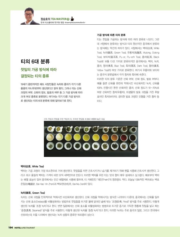 티는 크게 6대 분류로 나눌 수 있다. 백차, 녹차, 홍차, 황차, 청차(우롱차), 흑차(보이차 등)이다. 그리고 각 분류에 속하는 수없이 많은 티들은 독특한 향미와 색상을 띠면서 현재 전 세계인들의 입맛을 사로잡고 있다. 또한 오늘날 티는 건강에 대한 의식 증가와 웰니스의 열풍으로 인해 세계 음료 시장에서 물 다음으로 많이 소비되고 있다. 여기서는 그러한 티의 6대 분류에 대하여 간략히 소개한다.