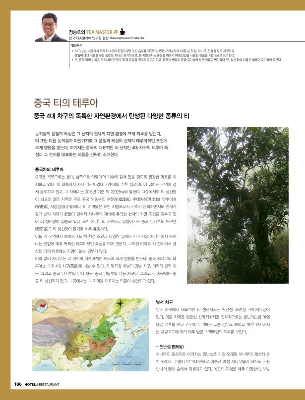 농산물의 품질과 특성은 산지의 자연환경에 크게 좌우를 받는다. 티 또한 여느 농산물과 마찬가지로 품질과 특성이 산지의 테루아적인 조건에 큰 영향을 받는데, 여기서는 중국티의 대표적인 산지인 ‘4대 차구’의 테루아와 각 산지의 대표적인 티를 간략히 소개한다.