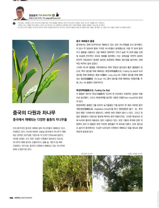 티의 종주국인 중국은 대륙에 걸쳐 차나무들이 재배되고, 또 자생하고 있다. FAO에 따르면, 오늘날 중국에서 차나무가 재배되는 면적은 2018년도 기준, 약 233만 6066ha(헥타르)에 달한다. 이러한 곳에는 크고 작은 수많은 다원들이 분포하는데, 차나무의 재배 방식도 산울타리식, 덤불 숲, 계단식 등 매우 다양하다. 여기서는 중국의 다원에서 재배되는 차나무에 관해 간략히 소개한다.