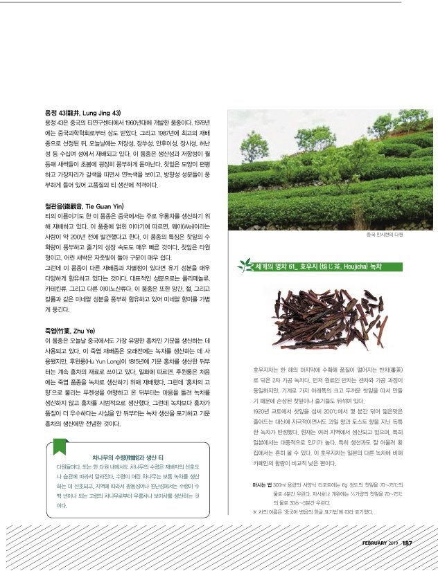 용정 43은 중국의 티연구센터에서 1960년대에 개발한 품종이다. 1978년에는 중국과학학회로부터 상도 받았다. 그리고 1987년에 최고의 재배종으로 선정된 뒤, 오늘날에는 저장성, 장쑤성, 안후이성, 장시성, 허난성 등 수십여 성에서 재배되고 있다. 이 품종은 생산성과 저항성이 월등해 새싹들이 초봄에 굉장히 풍부하게 돋아난다. 찻잎은 모양이 편평하고 가장자리가 갈색을 띠면서 연녹색을 보이고, 방향성 성분들이 풍부하게 들어 있어 고품질의 티 생산에 적격이다.