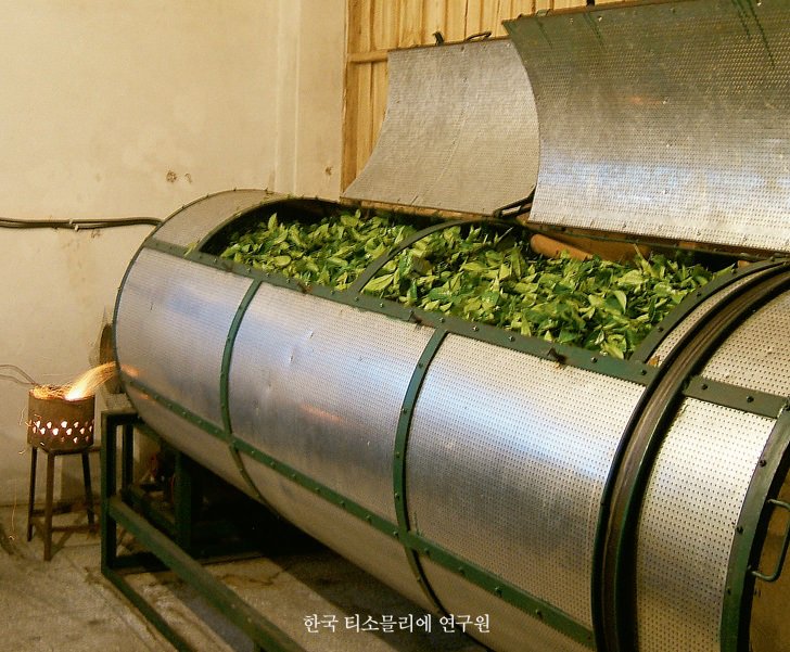 산화 과정을 거치고 나면 녹차의 특성을 갖게 하는 살청 작업에 들어간다. 살청 작업은 알다시피 단백질인 산화 효소를 가열해 변성시켜 산화를 중단시키는 기능을 한다. 이러한 살청은 전통적으로 솥이나 팬에서 덖듯이 기계적으로는 회전식 원통에 넣고 진행한다.