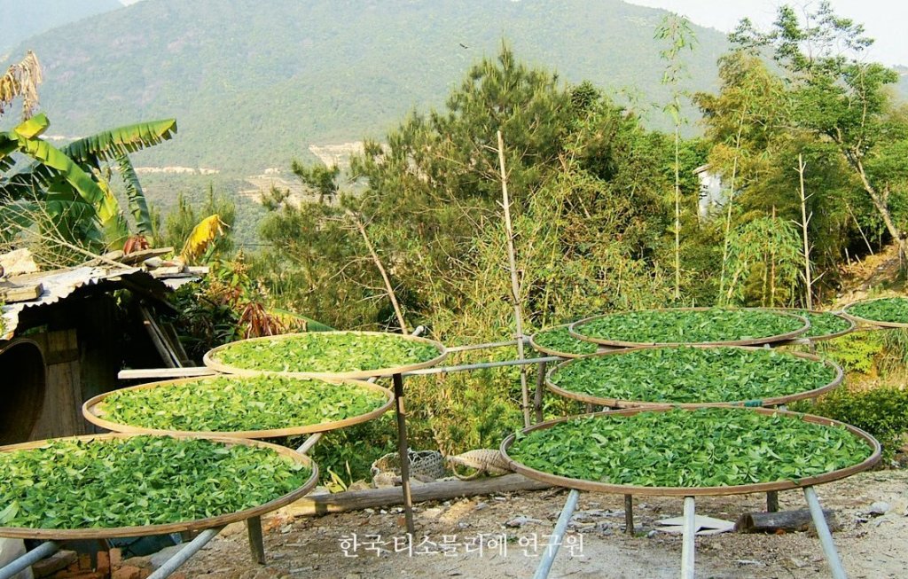 이렇게 성숙한 찻잎은 위조과정을 거치는데, 보통은 야외에서 선반이나 천 위에 고루 깔아 놓고 진행한다. 그날의 날씨에 따라 달라지겠지만, 약 2시간 정도 소요된다.
