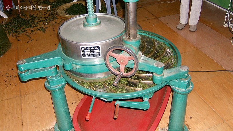 아래쪽에 빗살 모양의 틀이 있고 그 위에서 찻잎을 비틀고 휘마는 유념기.