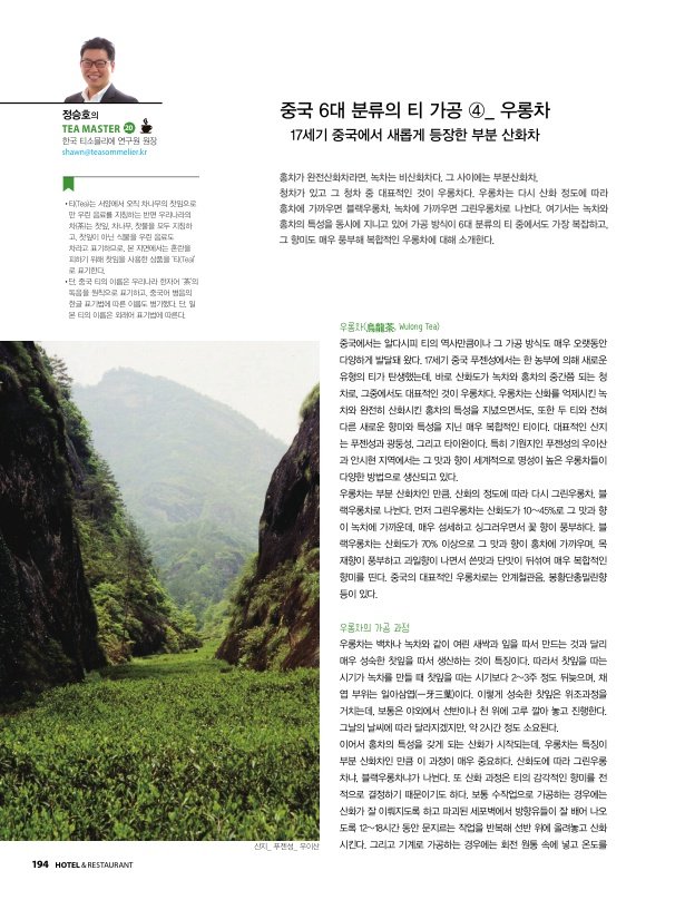 홍차가 완전산화차라면, 녹차는 비산화차다. 그 사이에는 부분산화차인 청차가 있고, 그 청차 중에서도 대표적인 것이 우롱차다. 우롱차는 산화도에 따라 홍차에 가까우면 블랙우롱차, 녹차에 가까우면 그린우롱차로 나뉜다. 여기서는 녹차와 홍차의 특성을 동시에 지니고 있어 가공 방식이 6대 분류의 티 중에서도 가장 복잡하고, 그 향미도 매우 풍부하고 복합적인 우롱차에 대해 소개한다.