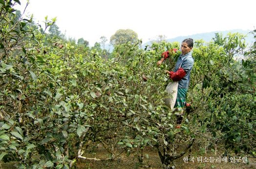 윈난성의 한 다원에서 보이차를 생산하기 위해 운남대엽종의 찻잎을 수확하는 모습.