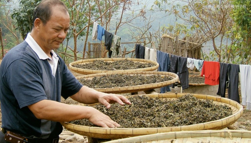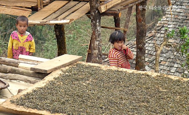 햇볕에 찻잎을 펼쳐서 말리는 건조 작업.