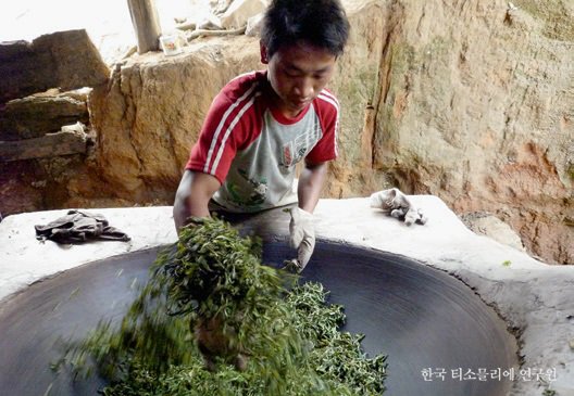 찻잎을 가열된 팬에 놓고 덖어서 산화를 인위적으로 중단시키는 살청 과정.