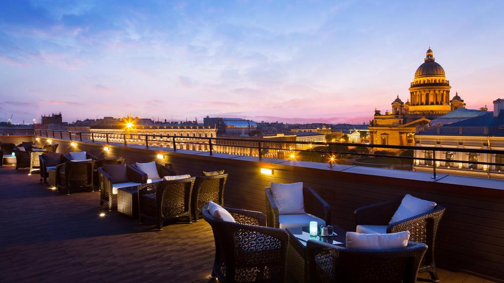 이곳 9층의 옥상에 있는 ‘벨뷰 레스토랑(Bellevue Restaurant)’은 에르미타주 미술관과 궁전 광광을 비롯해 상트페테르부르크의 스카이라인을 한눈에 감상할 수 있어 전망이 빼어난 곳이다. 실내는 검은 대리석과 목재로 현대적인 럭스리 스타일로 장식되어 있어 화려하다. 이곳에서 18세기로 거슬러 올라가는 상트페테르부르크 지방의 전통 요리에 기초하여 유럽의 요소를 가미한 미식 요리들은 감탄을 자아낼 것이다. 또한 실내 바에서는 다양한 칵테일과 와인을 즐길 수도 있다. 외부의 테라스에서도 상트페테르부르크의 야경을 감상하면서 디너를 경험해 보길 바란다. 물론 와인, 칵테일, 보드카, 비터, 셰리, 리커, 폴라가르, 럼, 테킬라 등 다양한 주류도 취향대로 선택하여 즐길 수 있다.