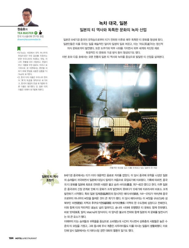 일본은 8세기경 중국의 유학승으로부터 티가 전파된 이후로 매우 독특한 티 문화를 형성해 왔다. 일본인들은 티를 우리는 일을 예술적인 일이자 일생의 일로 여겼고, 이는 ‘차도(茶道)’라는 정신적 의식 문화로까지 발전됐다. 또한 도쿠가와 막부 시대를 거치면서 외부 세계와 차단된 채로 독창적인 티 문화와 가공 방식 등이 형성되기도 했다. 여기서는 오랜 전통의 일본 티 역사와 녹차를 중심으로 발달된 티 산업을 살펴본다.